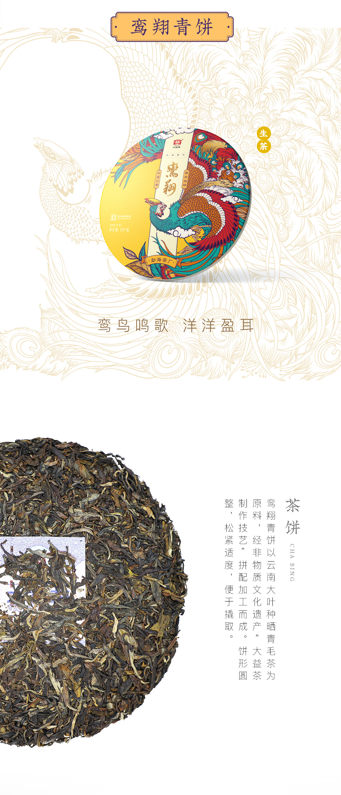 配料:延續(xù)了勐海茶品的傳統(tǒng)味道,采用勐海地區(qū)大葉種曬青毛茶為原料,進(jìn)行拼配而成。